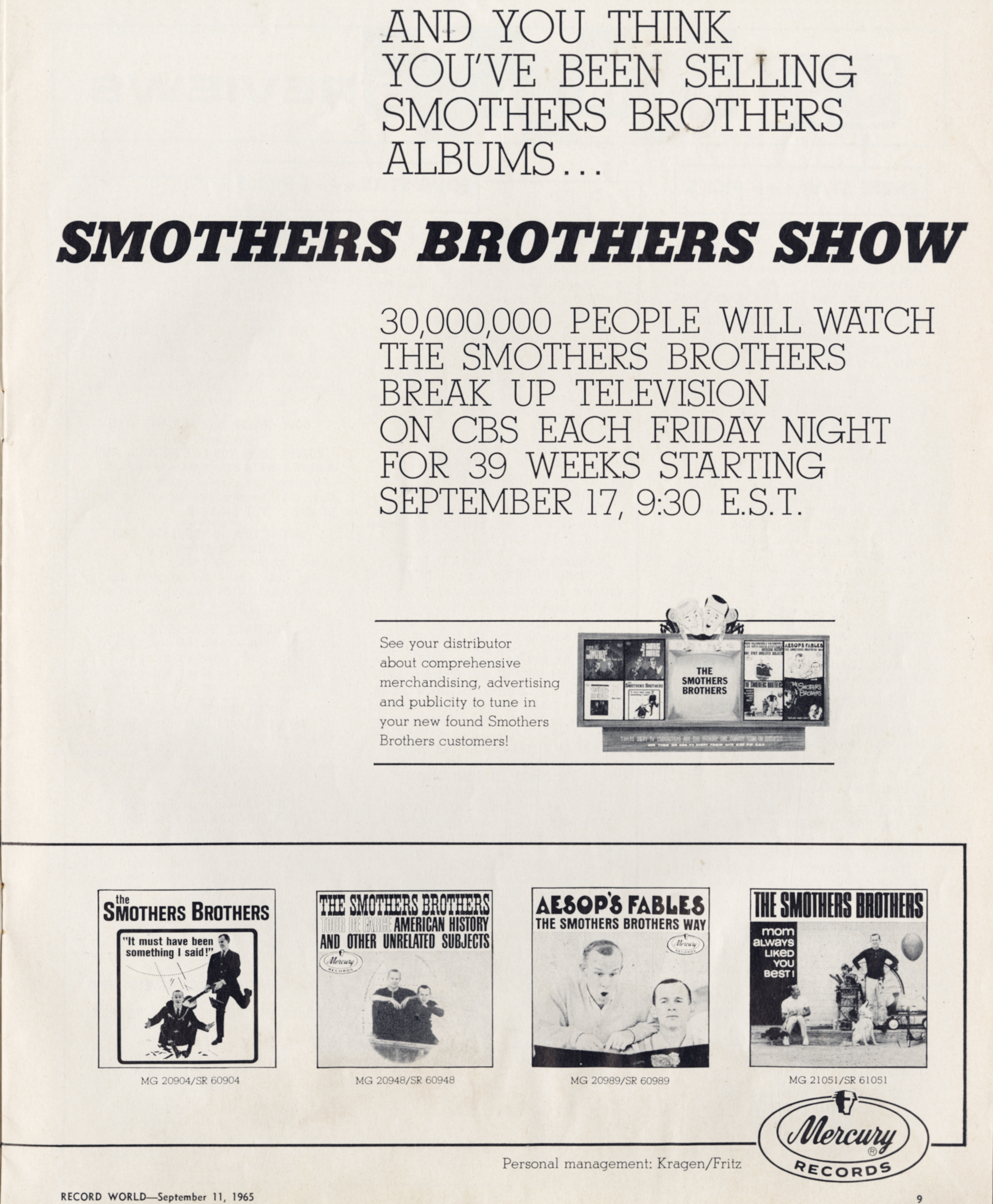 The Smothers BrothersSmothers Brothers Smothers Brothers American singers, musicians and comedians The Smothers Brothers were the American duo of brothers Tom and Dick Smothers, who performed music and comedy. The brothers' trademark double act was performing folk songs (Tommy on acoustic guitar, Dick on double bass), with Tommy (the elder of the two) acting clueless and Dick as his straight man, which usually led to arguments. Tommy's signature line was "Mom always liked you best!"[1] Smothers Brothers in 1965 In the late 1950s and early '60s, the brothers frequently appeared on television variety shows and issued several popular record albums of their stage performances. Their own television variety show, The Smothers Brothers Comedy Hour, became one of the most controversial American TV… (Source: Wikipedia)