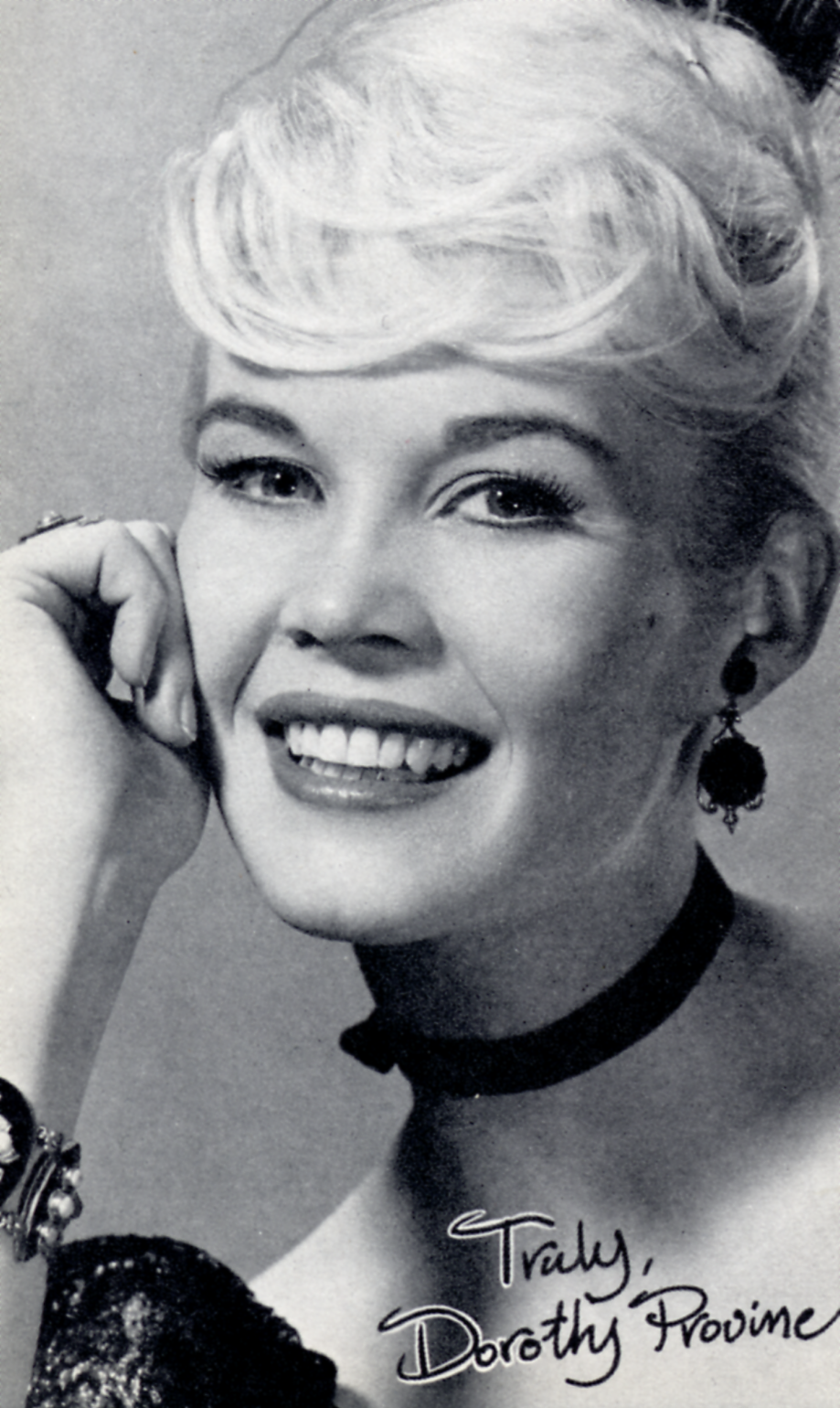 Dorothy ProvineDorothy Provine Dorothy Provine American singer, dancer, actress (1935–2010) Dorothy Michelle Provine (January 20, 1935 – April 25, 2010) was an American singer, dancer and actress.[1] Born in 1935 in Deadwood, South Dakota, she grew up in Seattle, Washington, and was hired in 1958 by Warner Bros., after which she first starred in The Bonnie Parker Story and played many roles in TV series. During the 1960s, Provine starred in series such as The Alaskans and The Roaring Twenties, and her major film roles included It's a Mad, Mad, Mad, Mad World (1963), Good Neighbor Sam (1964), The Great Race (1965), That Darn Cat! (1965), Kiss the Girls and Make Them Die (1966), Who's Minding the Mint? (1967), and Never… (Source: Wikipedia)
