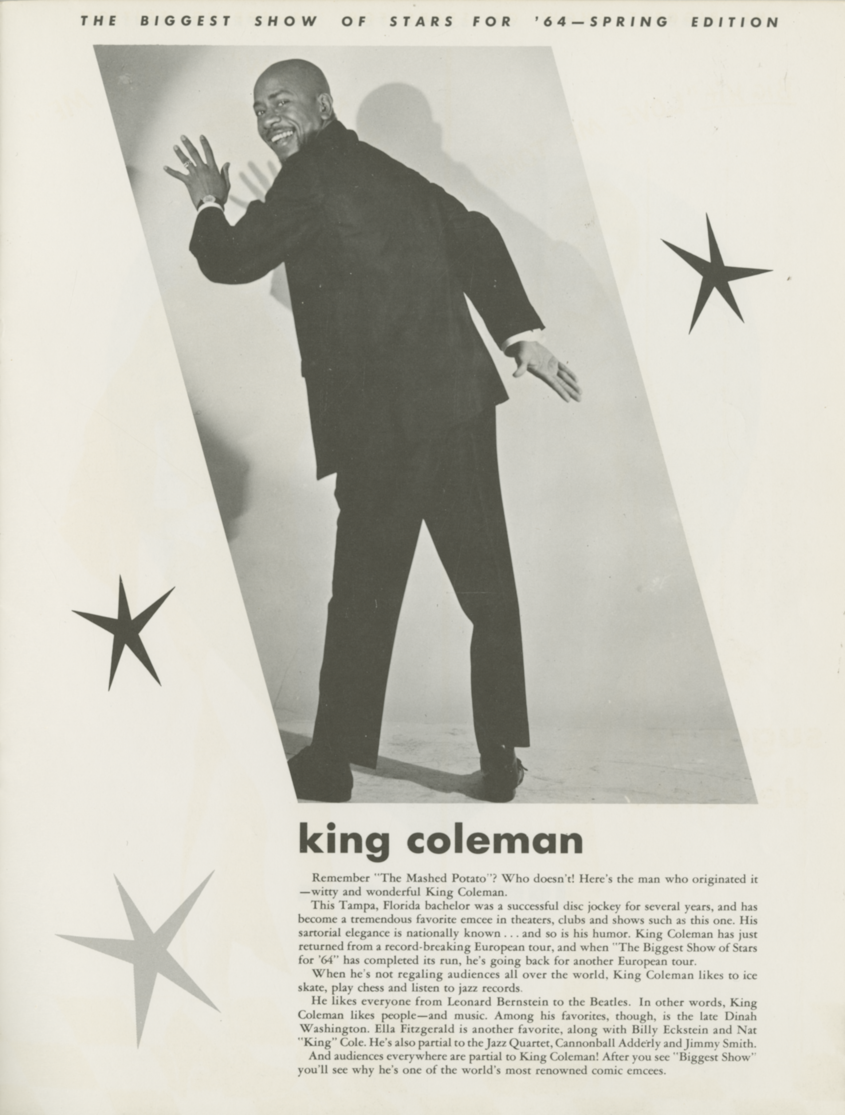 King ColemanKing Coleman King Coleman American singer-songwriter Carlton "King" Coleman (January 20, 1932 – September 11, 2010)[1] was an American rhythm and blues singer and musician, known for providing the vocals for the 1959 hit single, "(Do The) Mashed Potatoes", recorded with James Brown's band. Over the course of his singing career, Coleman released numerous singles that have been re-released on compilation albums, as well as the 2003 retrospective, It's Dance Time, released by Norton Records. He performed on stage as recently as 2005 on a tour of the U.S. East Coast, backed by the Florida garage band The Creepy T's, headlining the WFMU record fair in New York City.[2] This article needs additional citations for verification. (September 2010) Quick facts… (Source: Wikipedia)