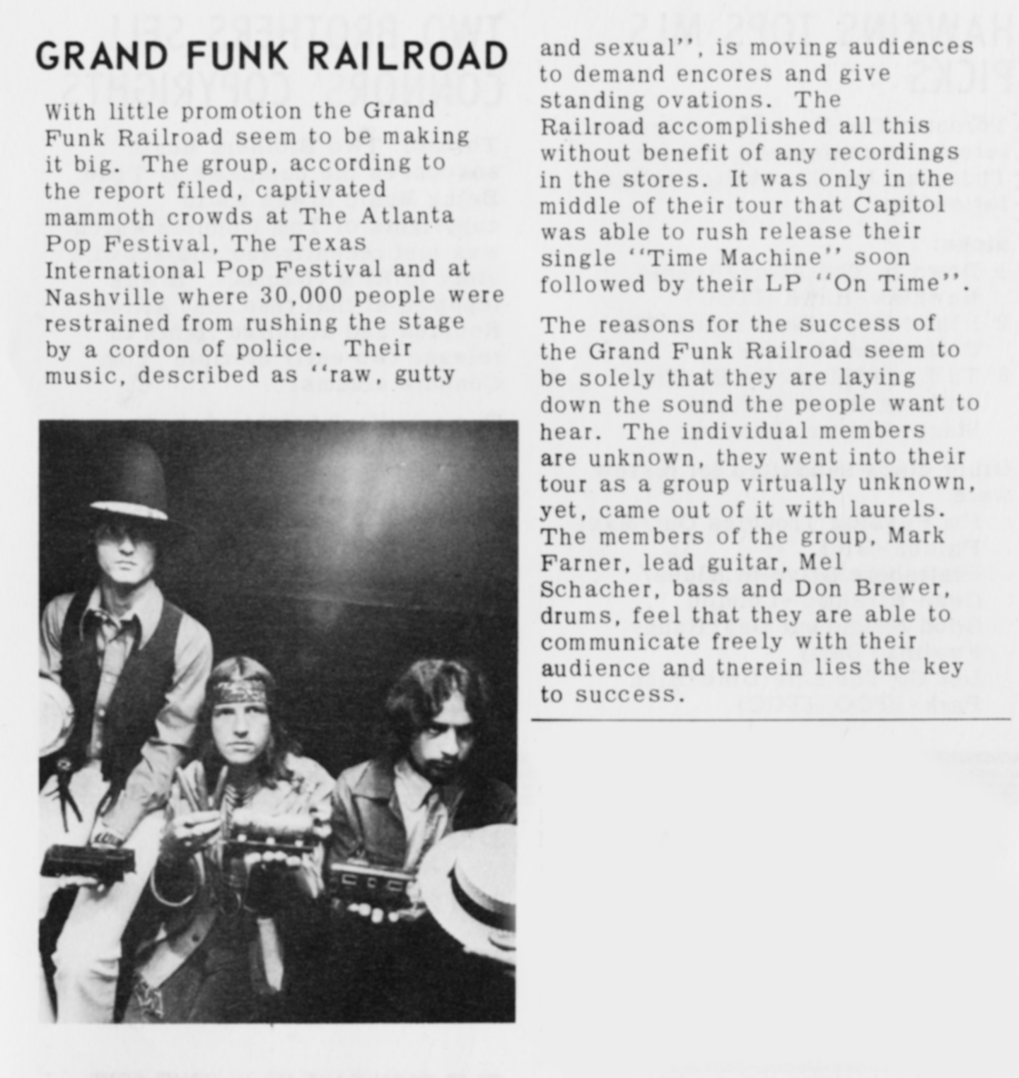 Grand Funk RailroadGrand Funk Railroad Grand Funk Railroad American band "Grand Funk" redirects here. For the album, see Grand Funk (album). Grand Funk Railroad (often shortened to Grand Funk) is an American rock band formed in Flint, Michigan, in 1969 by Mark Farner (vocals, guitar, keyboards, harmonica), Don Brewer (drums, vocals) and Mel Schacher (bass). The band achieved peak popularity and success during the 1970s with hit songs such as "We're an American Band", "I'm Your Captain (Closer to Home)", "Some Kind of Wonderful" (a cover of Soul Brothers Six), "Walk Like a Man", "The Loco-Motion" (a cover of Little Eva), "Bad Time" and "Inside Looking Out" (a cover of the Animals).[2][3] Grand Funk released six platinum and seven gold-certified albums between… (Source: Wikipedia)