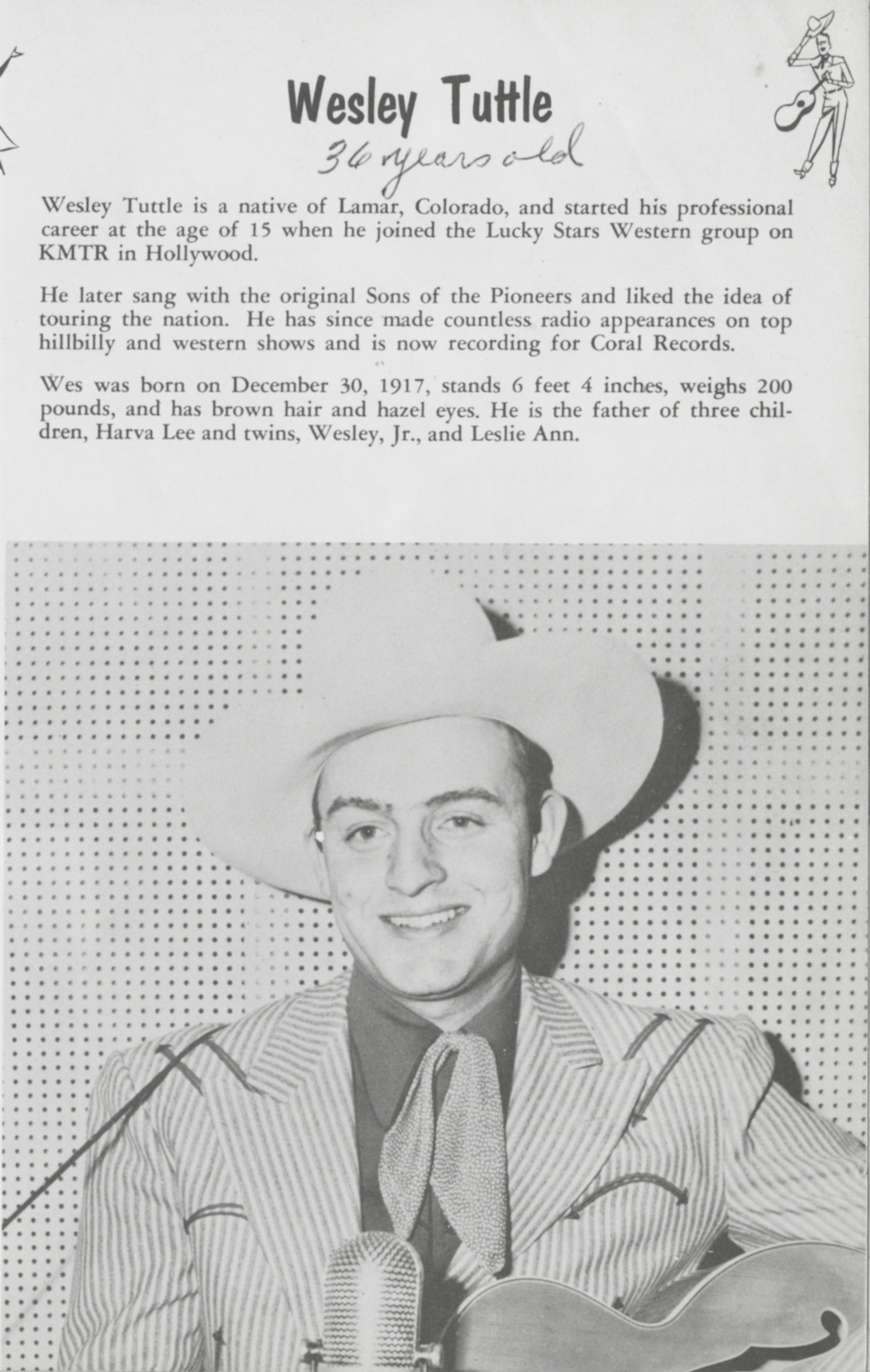 Tuttle Wesley And MarilynWesley Tuttle Wesley Tuttle American singer-songwriter Wesley Leroy Tuttle (December 30, 1917, in Lamar, Colorado – September 29, 2003) was an American country music and gospel singer and songwriter. Quick facts Background information, Born ... Wesley Tuttle Background information Born (1917-12-30)December 30, 1917 Origin Lamar, Colorado, United States Died September 29, 2003(2003-09-29) (aged 85) Genres Country, Gospel Occupation Singer-songwriter Instruments Vocals, guitar, ukulele Years active 1937–1973 Labels Capitol, Christian Faith Recordings, Sacred Records Close He was briefly a member of The Sons of the Pioneers, he made a number of successful recordings and became well known for his numerous TV appearances on programs like Town Hall Partyand Hometown Jamboree In his latter years he subsequently turned to exclusively recording Gospel… (Source: Wikipedia)