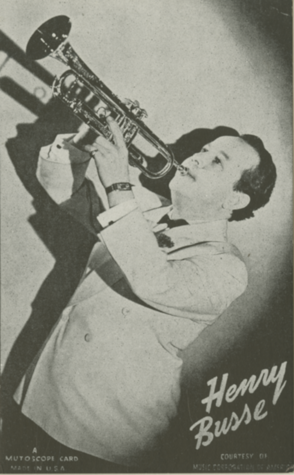 Henry BusseHenry Busse Henry Busse German jazz trumpeter For the photographer, see Henry Busse (photographer). Henry Busse Sr. (May 19, 1894 – April 23, 1955) was a German-born jazz trumpeter. A 1948 review in Billboard magazine said that Busse had "a keen sense of musical commercialism".[1] This article needs additional citations for verification. (August 2015) Quick facts Background information, Born ... Henry Busse Sr. Henry Busse c. 1943 Background information Born (1894-05-19)May 19, 1894 Magdeburg, Germany Died April 23, 1955(1955-04-23) (aged 60) Memphis, Tennessee Genres Jazz Occupation Musician Instrument Trumpet Close Early life Born May 19, 1894, in Magdeburg, Germany,[2] to a generational German Band family, Henry Busse studied violin and then trumpet (after a finger he had broken was set… (Source: Wikipedia)