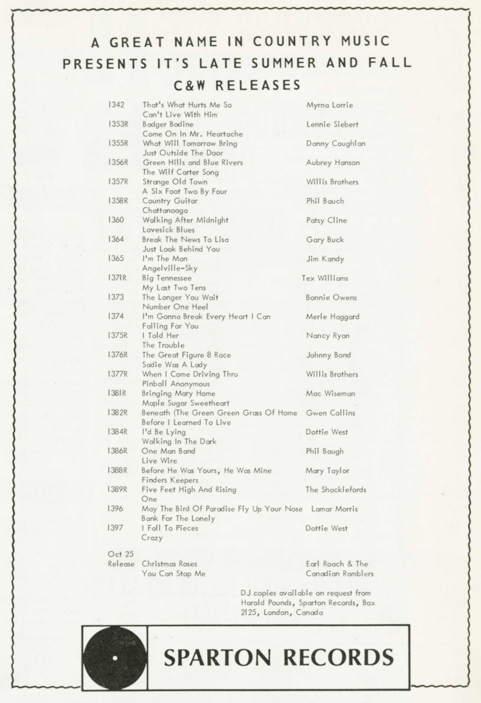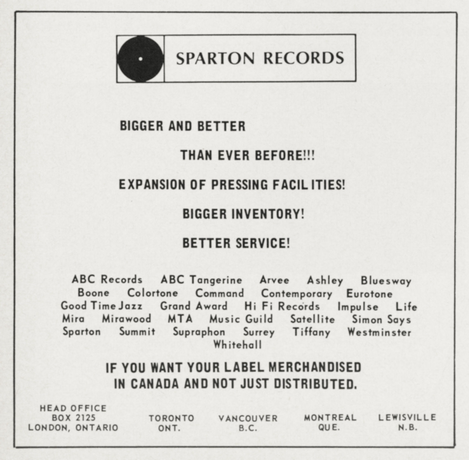 Sparton Records was founded in 1946 by the Sparton Corporation, originally known for manufacturing radios and phonographs. The label initially focused on producing popular music and jazz, quickly gaining traction in the post-war era. In the 1950s, Sparton expanded its catalog to include rock and roll, releasing records from notable artists such as The Four Lads and The Platters. Throughout the 1960s, Sparton diversified its offerings, venturing into country and folk genres, while also producing soundtracks and spoken word recordings. However, by the 1970s, the label faced increasing competition from larger companies and eventually ceased operations in the late 1970s. Despite its relatively short lifespan, Sparton Records left a mark on the music industry by contributing to the popularization of various genres and fostering the careers of several influential artists. Its legacy continues to be recognized by collectors and music historians.