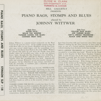 Piano Rags Stomps And Blues Played By Johnny Wittwer